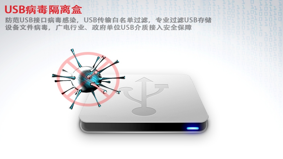 1、防范 USB 接口病毒感染; 2、USB 传输白名单过滤; 3、专业过滤 USB 存储; 4、过滤设备文件病毒; 5、广电行业及各类机构USB 介质接入安全保障。