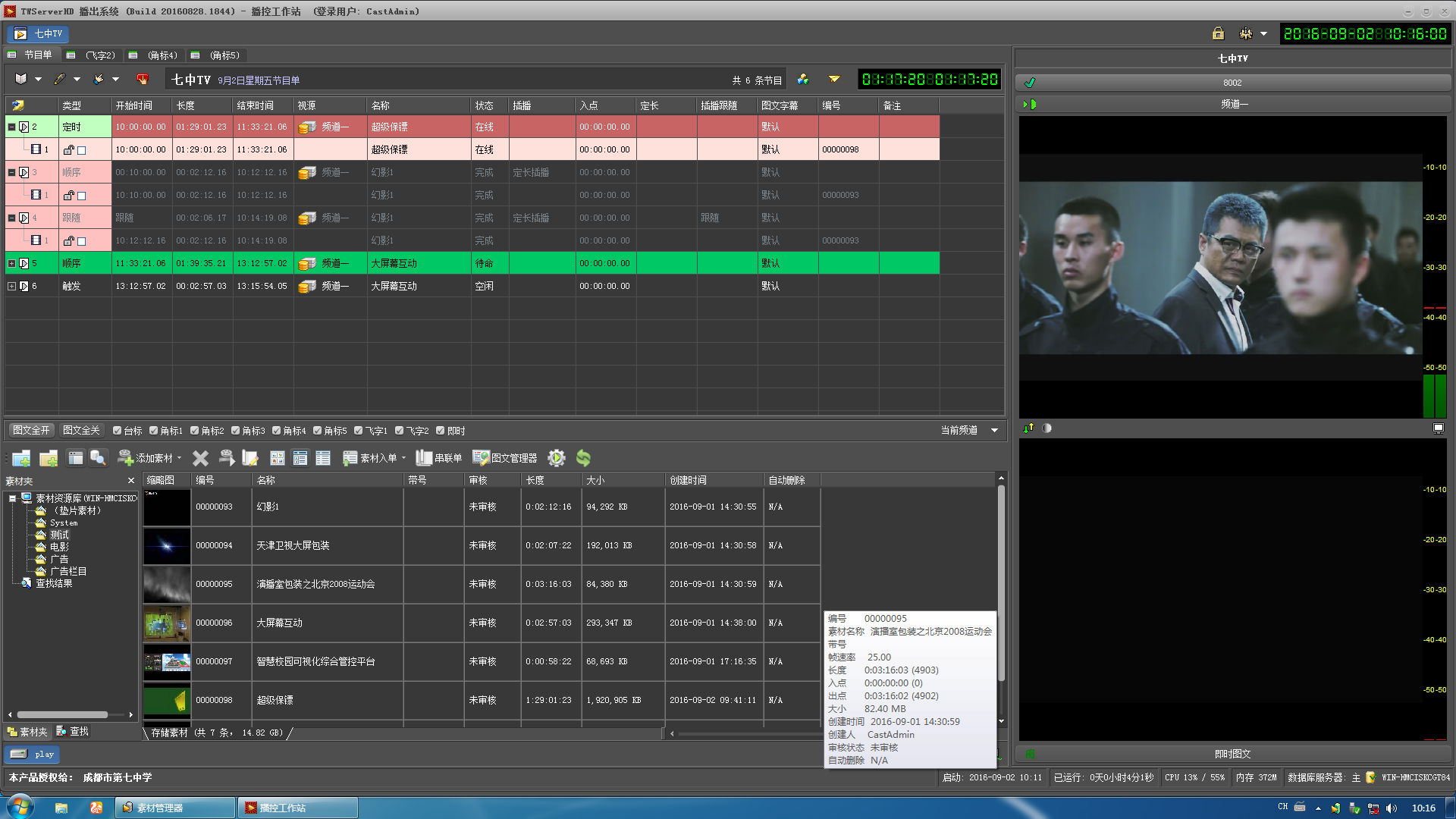 以“简约流程”+“素材统一”+“实时容错”+“安全稳定”为主线,以设“ 设备监控+流程监控+节目单驻留”为辅线配合,集安全性、稳定性以及灵活性为一体,支持标清、高清、高标清同播、4K频道的建设。支持磁带播出、盘带结合播出、服务器播出、控制机播出、N+1冷备播出、控播分离/控播集成模式、单/多通道播出、截播等不同的播出模式。